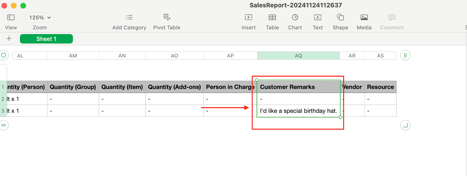 Step 2: Once you open the report, scroll to column AQ labeled [Customer Remarks]. The customer’s notes will be displayed in this column.