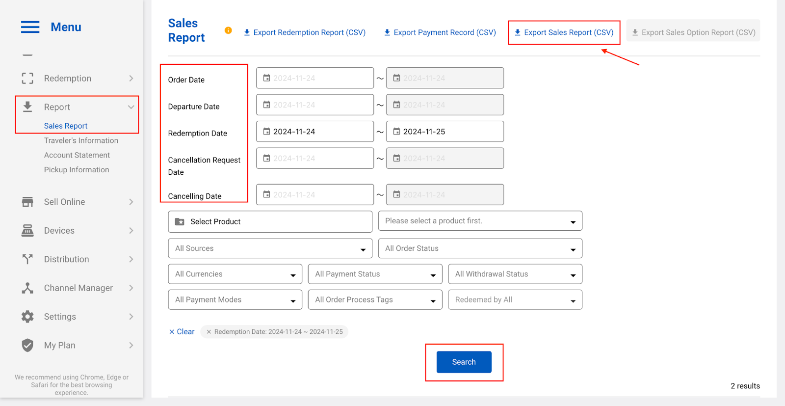 Step 1: Go to [Sales Report] > select [Date Range] on type of report you would like to download > [Search] > [Export Sales Report]
