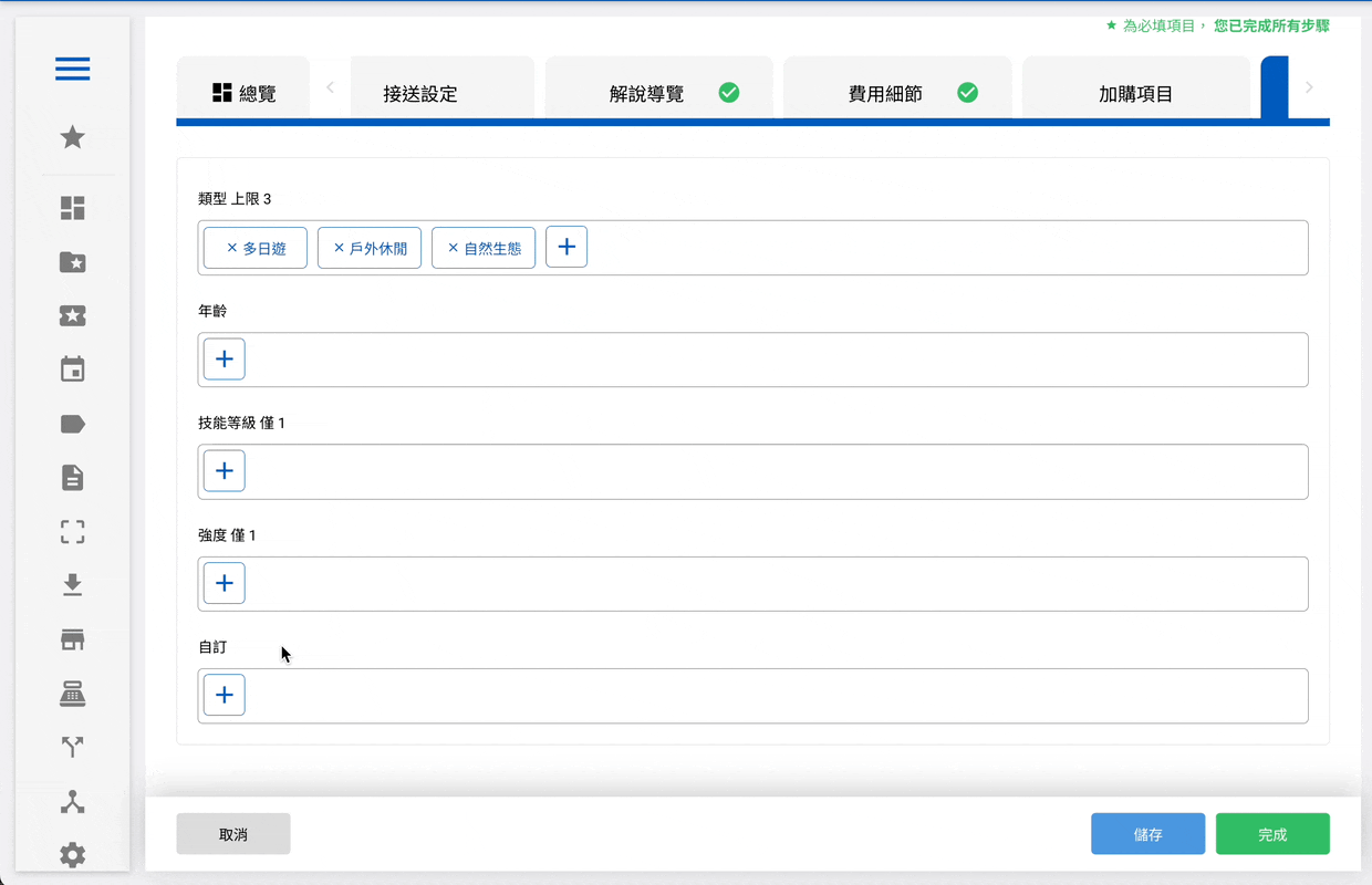 這篇指南將說明 rezio Admin 後台 中,如何操作行程中的行程表、地點、接送設定、解說導覽、費用細節、加購項目、屬性字等設定,讓您的行程頁面更加豐富!