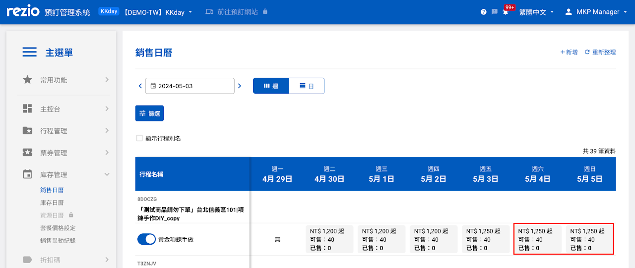 銷售日曆更新完成,您可看到明天後的銷售日曆已呈現新價格(範例:5/3 更新,5/4 後價格變更為 NT$1,250)