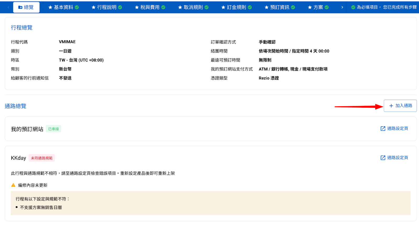 之後當您重新整理此行程的「總覽」頁籤,都可以查看商品的通路狀態與檢核結果,若因為內容編修而導致不符通路規範時,也會立刻顯示在此處。如有需要更新通路設定,也可直接點選【通路設定頁】前往操作。