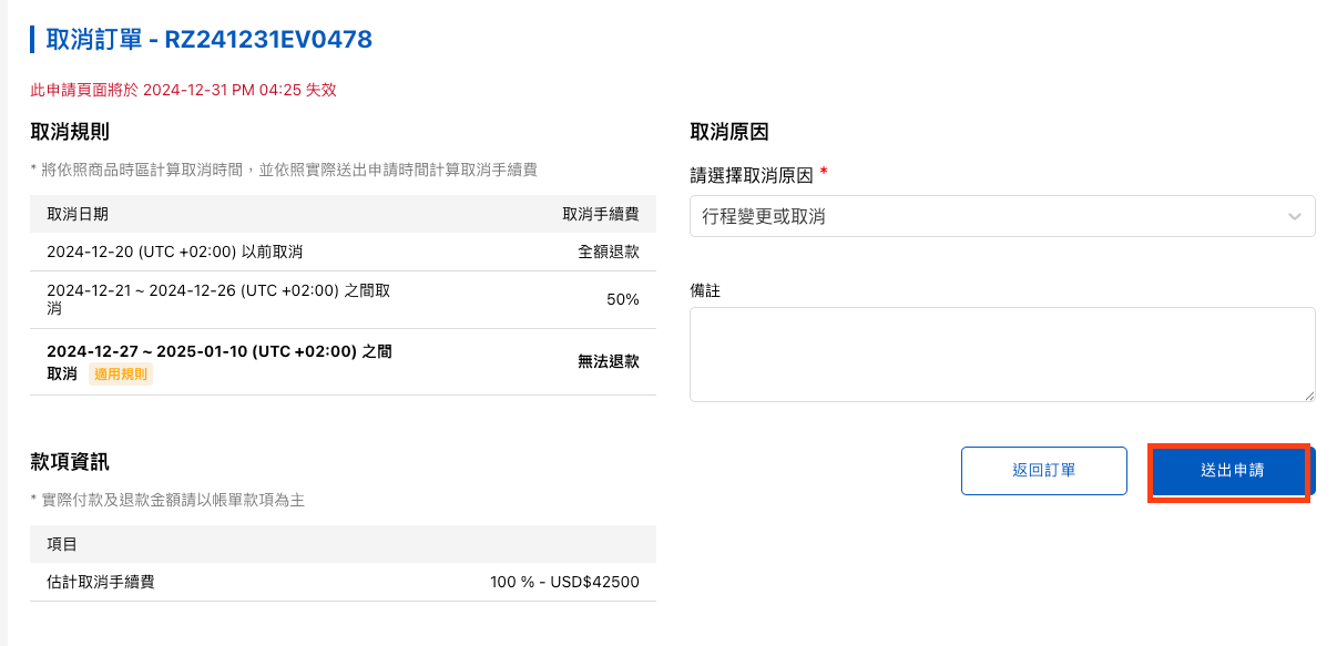 注意: 該按鈕僅為向店家「申請取消」,客人端無法直接取消