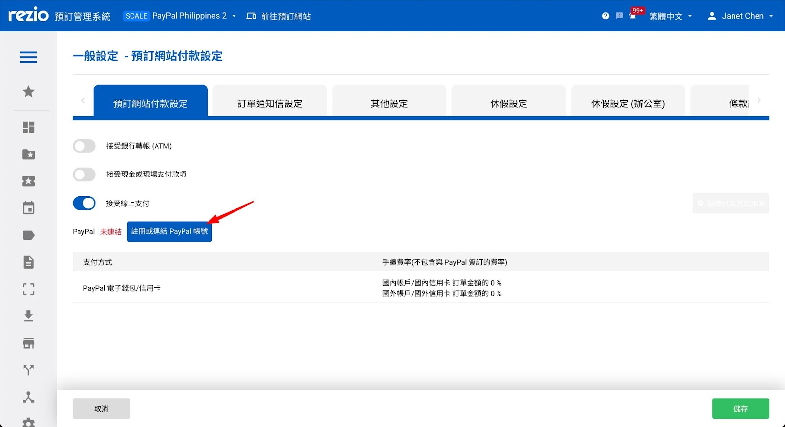PayPal 服務開通後,您便可在「我的預訂網站」讓顧客使用 PayPal 線上支付。