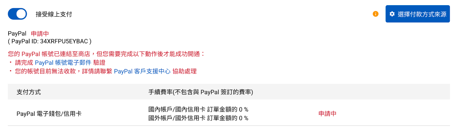 說明:若您的畫面顯示「申請中」,請先確認您的 PayPal 帳號是否已完成 Email 與銀行帳戶的驗證。若您的帳戶已驗證完成,請等待 1 個工作天,便能開始使用。