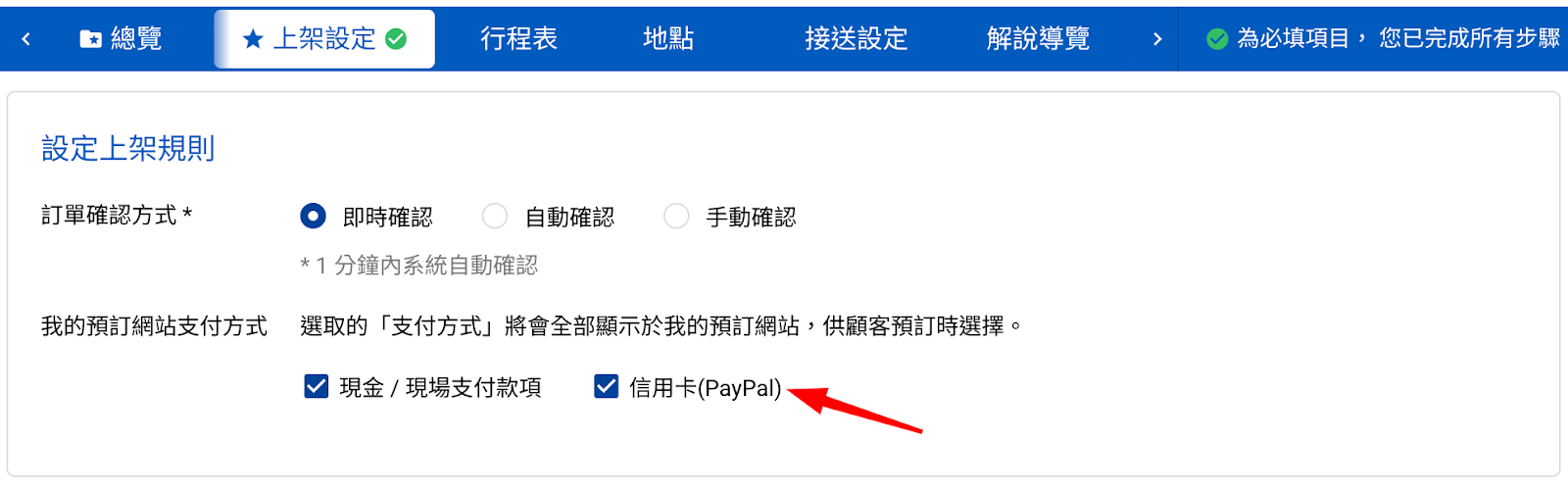 接著,您便可以到「上架設定」勾選 PayPal,讓顧客使用 PayPal 支付。