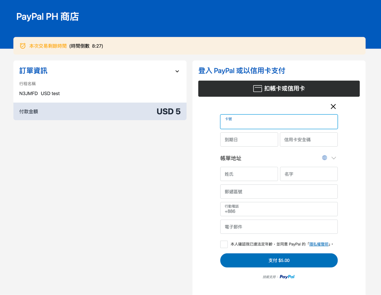 範例:若行程幣別為 USD,顧客使用 TWD 結帳,而您的 PayPal 收款幣別(Primary Currency)為 PHP 時。
